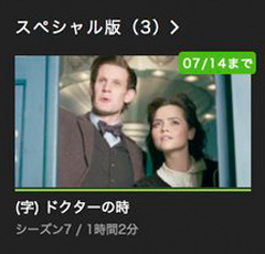Huluの「ドクター・フー」アイコンに配信終了日が表示されていた。慌てて確認したら、スペシャル版が2本、7/14で配信終了みたい。ほっ。全部観られなくなるのかと思って焦った。これだから手元にDVDが欲しくなる。