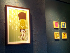 カーヤと一緒に、カフェエスキスで開催中の、りゅうくの個展「anoko」 monkey-trapper exhibition at CAFE ESQUISSEを観て来た。カフェの壁に沢山の絵が飾られていて、席に着いてゆっくり観覧。